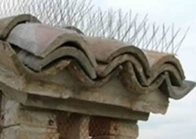 - Dissuasori meccanici. Questi sistemi sono pensati per proteggere superfici di piccole dimensioni, come comignoli, sporgenze, parapetti, ecc. È costituita da un numero variabile di punte metalliche con diverse angolazioni fissate su supporti metallici o in policarbonato. Questa installazione è particolarmente economica e si presta bene ad un utilizzo combinato con altri sistemi di allontanamento, come impianti elettrificati, reti antintrusione, ecc.